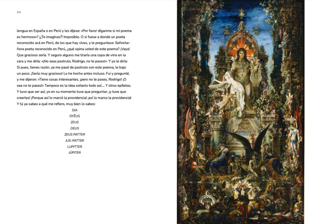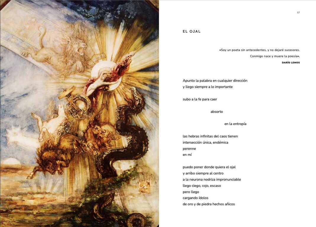 -En efecto es un tributo a Ícaro. Sin embargo, tomando en cuenta el sentido simbólico del mito, es un tributo también a lo siguiente: al instinto humano de grandeza, que nos lleva a ejecutar labores extraordinarias, y que a menudo nos llevan también a nuestra propia destrucción. Busco honrar al ser humano y su belleza, aceptando su lado oscuro tanto como su lado luminoso, su ‘chiaroscuro’. La temática y la forma no son modernas; Ícaro es atemporal, y este libro busca retratarlo así, alejado de toda modernidad. Por eso, hay tantos idiomas en el libro, algunos versos en francés, subtítulos en árabe, citas de la Divina Comedia de lenguajes inexistentes, latín, entre otros. A su vez, hago uso en este libro de todas las posibles mitologías que han llegado a mi conocimiento durante años de viajes y estudios. Desde los 18 años, viví en países y culturas muy distintas, que han informado mis ideas de lo sacro. He querido plasmar todo eso en el libro, y busco retratar aquello que todas las almas tienen en común, eso que está presente desde el Advaita vedanta hasta la espiritualidad contemporánea. En ese sentido, el libro no puede ni desea ser moderno, pues lo moderno es demasiado circunstancial, carece de eternidad y de aura (en palabras de Walter Benjamin). Por eso utilizo un lenguaje no coloquial, porque las ambiciones de Ícaro se marchitarían si escribiera de manera ‘conversacional’, como es habitual en la poesía contemporánea. En resumen: para explorar el espíritu de Ícaro, debía ser anti-coloquial, anti-moderno, y buscar lo atemporal y lo eterno. Es lógico que el proyecto del libro sea ‘arrogante’ en alguna medida, pues ese es uno de los grandes temas del mito. Esto lo explora, por ejemplo, el escritor Italiano Gabriele D’Annunzio en su gran poema sobre Ícaro, el cual cito dos veces para mis epígrafes.